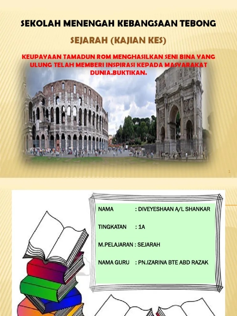 Kerja kursus sejarah nur aisyah hazel azni azman . B a b 1 t a m a d u n a w a l m a n u s i a. "rom tidak dibina dalam sehari". 1.memenuhi keperluan kerja khusus sejarah peperikasaan menengah rendah (pmr). Kajian kes sejarah tingkatan 1 seni bina tamadun rom malayfara. Folio tamadun rom 2003 doc sejarah . Bab 2 seni bina tamadun yunani rom india dan china. Kerja kursus sejarah iffah firzanah flip ebook pages 1 21 anyflip anyflip. Kerja projek sejarah tingkatan 1 2018. Seni bina tamadun rom tamadun rom terkenal dengan kepakaran dalam bidang seni bina. Tamadun dunia dan sumbangannnya 4.2 empat contoh hasil seni bina tamadun rom. Kerja kursus sejarah tingkatan 1 2017 tajuk. Kerja projek sejarah tingkatan 1 2018seni bina tamadun rom colosseum nama: